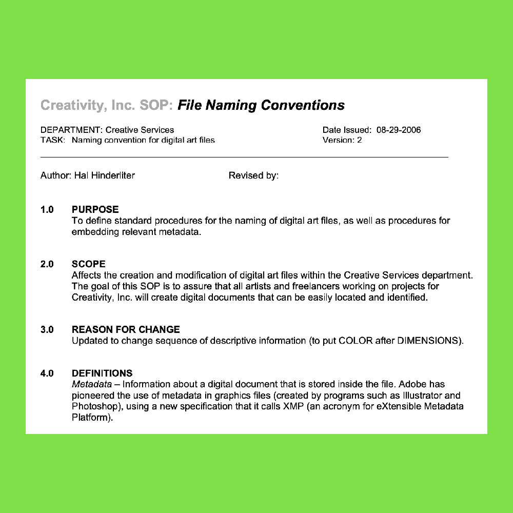 As a consultant to the printing industry, I was often tasked to develop Standard Operating Procedures for my clients. This is an example of an SOP on File Naming Conventions, developed for an art studio in California.